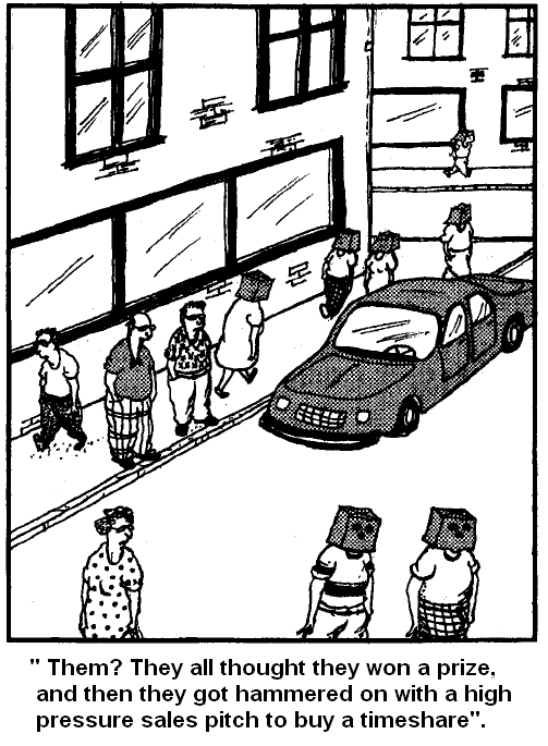 In any event, Mr. P.K. continued his sales pitch with another question “wouldn’t you agree that this second (the lower priced) timeshare week is a better offering?”. I’m thinking that neither of these offerings is the least bit appealing to me, because I can’t use either one. However, to humor the salesman, my wife and I conceded that yes the lower priced timeshare week is a better offering. That was a mistake . . . I quickly learned that any answer to this “set up” question provides the sales person with an open door to hammer on us to buy it, based on the “false premise” that just because you say it’s a better offering, then that must imply that you want it. Our response that the less expensive timeshare week was preferable was simply twisted and used as leverage to hammer on us to buy it. In any case, we finally were able to defend ourselves against the high pressure tactics that were based on this “false premise”.