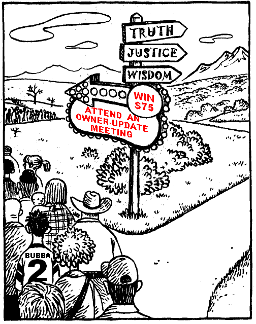 In retrospect, I can now see where the sales associates’ deceptive hype and fake sense of urgency for customers to hurry up and buy, are total fabrications. In reality, customers could wait months or years to buy another timeshare week, and it is quite likely that the customer will get the same (if not better) deal during a future Owner-Update meeting. For the past several years I seemed to get calls every few months to attend yet another B.A.D.S.H.I.T. Owner-Update meeting, which totally supports the agenda that Silverleaf wants you to continue coming to future sales pitch meetings. Even after attending such meetings I have received those blue or yellow AVC postcards in the mail, in which I was invited to attend another Silverleaf B.A.D.S.H.I.T. meeting under the pretense that I’ve won a prize.
